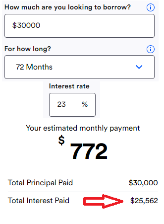 This insane interest rate will cause you to pay for the car twice by the time you pay it off. See the calculators below for the math!
