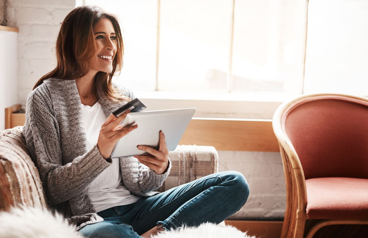 Woman in gray cardigan smiling while holding a tablet and a credit card, sitting on a couch in a sunny living room.